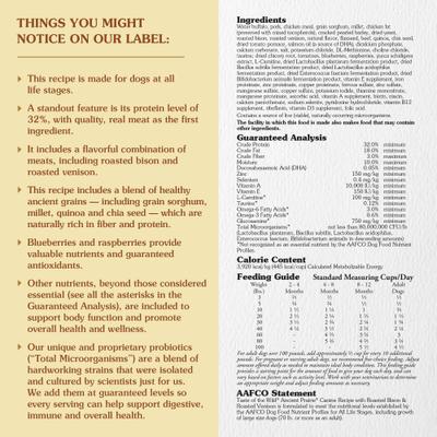 - This roasted bison and roasted venison dry dog food with ancient grains is crafted with real meat as the #1 ingredient and is high in protein (32%) to help support bones, joints and lean muscles.