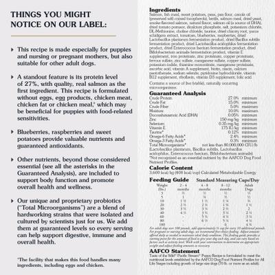 - This smoke-flavored salmon dry puppy food is crafted with real fish as the #1 ingredient and is high in protein (27%) to help support bones, joints and lean, strong muscles in puppies and nursing or pregnant mothers.
