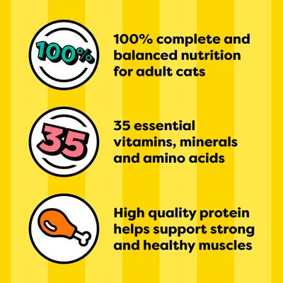 - Provides 100% complete and balanced nutrition for adult cats and keeps them hydrated.