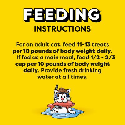 For an adult cat, feed 11-13 treats per 10 pounds of body weight daily. If fed as a main meal, feed 1/2 - 2/3 cup per 10 pounds of body weight daily. Provide fresh drinking water at all times.