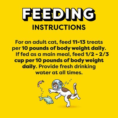 For an adult cat, feed 11-13 treats per 10 pounds of body weight daily. If fed as a main meal, feed 1/2 - 2/3 cup per 10 pounds of body weight daily. Provide fresh drinking water at all times.