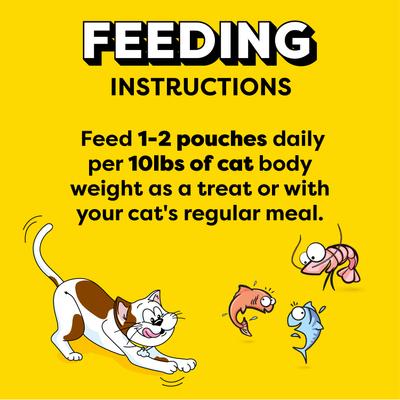 FEED 1-2 POUCHES DAILY PER 10LBS OF CAT BODY WEIGHT AS A TREAT OR WITH YOUR CAT'S REGULAR MEAL.