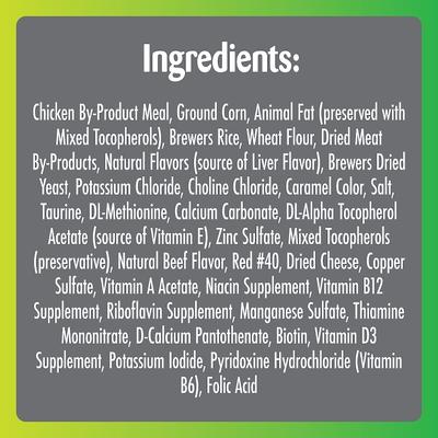 Chicken By-Product Meal, Ground Corn, Animal Fat (Preserved With Mixed Tocopherols), Wheat Flour, Brewers Rice, Dried Meat By-Products, Natural Flavors (Source Of Liver Flavor), Brewers Dried Yeast, Potassium Chloride, Choline Chloride, Caramel Color, Salt, Dl-Methionine, Taurine, Calcium Carbonate, Vitamin E Supplement, Zinc Sulfate, Ferrous Sulfate, Natural Beef Flavor, Red #40, Dried Cheese, Mixed Tocopherols (Preservative), Copper Sulfate, Vitamin A Supplement, Citric Acid (Preservative), Niacin Supplement, Vitamin B12 Supplement, Riboflavin Supplement, Manganese Sulfate, Thiamine Mononitrate, D-Calcium Pantothenate, Pyridoxine Hydrochloride (Vitamin B6), Vitamin D3 Supplement, Biotin, Potassium Iodide, Folic Acid, Rosemary Extract.