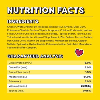 Ingredients: Chicken, Water, Poultry By-Products, Wheat Flour, Glycine, Guar Gum, Potassium Chloride, Sodium Tripolyphosphate, Calcium Carbonate, Natural Flavor, Choline Chloride, Magnesium Sulfate, Tapioca Starch, Taurine, Salt, Thiamine Mononitrate, Vitamin E Supplement, Zinc Sulfate, Ferrous Sulfate, Iron Oxide Color, Vitamin D3 Supplement, Manganese Sulfate, Copper Sulfate, Pyridoxine Hydrochloride, Potassium Iodide, Folic Acid, Menadione Sodium Bisulfite Complex.