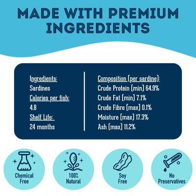 - Raw sardines are dehydrated to ensure that your furry friend is getting only the best protein available.