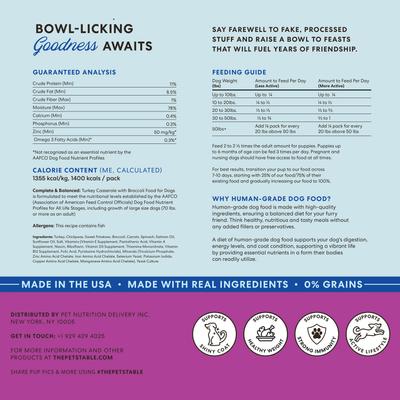 Treat your pup to The Pets Table Freshly Made Turkey Casserole Grain-Free & Human-Grade Frozen Dog Food—a grain-free, human-grade dog food brought to you by HelloFresh. The fresh, balanced recipe was developed in the USA with the help of vet nutritionists. It features high-quality turkey that’s gently baked with broccoli, carrots, chickpeas, and other superfoods—creating a delicious and nutritious meal your dog will adore. Please note, this product is produced in a facility that also processes eggs, fish, milk, peanuts, sesame, shellfish, soy, tree nuts, and wheat.