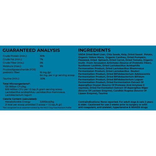 Hígado de res, semillas de chía, algas marinas, batata, Maca Amarilla, Prebióticos, Probióticos, Enzimas Digestivas.