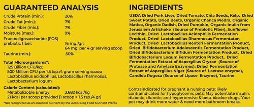 Pork Liver, Chia Seeds, Kelp, Sweet Potato, Chanca Piedra, Prebiotics, Probiotics, Digestive Enymes.