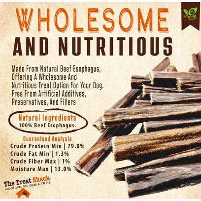 Palitos de esófago de res The Treat Shack de 30 cm Las golosinas para perros están repletas de delicioso sabor y además ofrecen un momento de diversión para masticar. Hechas de esófago de res natural, estas golosinas no contienen aditivos, conservantes ni rellenos artificiales. Son masticables y ligeramente crujientes, lo que proporciona una salida para las ganas de masticar de tu peludo. Además, son muy digeribles, ideales para cachorros con estómagos sensibles. Al ser bajas en grasa, son una opción más ligera para los peludos que necesitan cuidar su peso. A medida que su perro mastica, las golosinas ayudan a eliminar la placa y el sarro para una mejor salud dental.