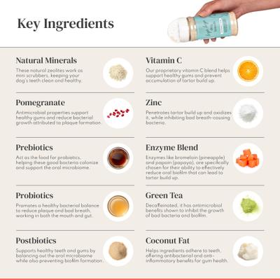 Active Ingredients: Natural Zeolites, Prebiotic (Inulin From Chicory), Pomegranate Extract, Proprietary Oral Health Enzyme Blend (Amylase, Protease, Bromelain, Papain, Cellulase, Hemicellulase, Lipase), Decaffeinated Green Tea, Yucca Schidigera Extract, Postbiotic Lactiplantibacillus Plantarum, Vitamin C, Taurine, Zinc Gluconate, Proprietary Probiotics Blend (Lactobacillus Acidophilus, Bacillus Coagulans, Enterococcus Faecium).