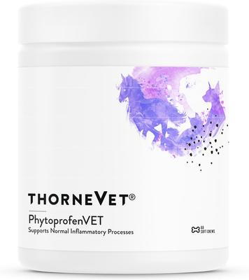 ThorneVET PhytoprofenVET Immune Chew Supplement combines a synergistic blend of ayurvedic herbs, including ginger, Boswellia, and CurcuVET. These botanicals work together to maintain a healthy balance of cytokines, which are important cell-signaling molecules that aid in immune responses and promote healing after injury or surgery. Plus, studies have shown that supplementation with bromelain can help reduce swelling and tenderness following a musculoskeletal injury. And the Boswellia extract in PhytoprofenVET has been shown to support healthy connective tissue in companion animals. Give your pet the comprehensive support they need with this easy-to-feed chew supplement.