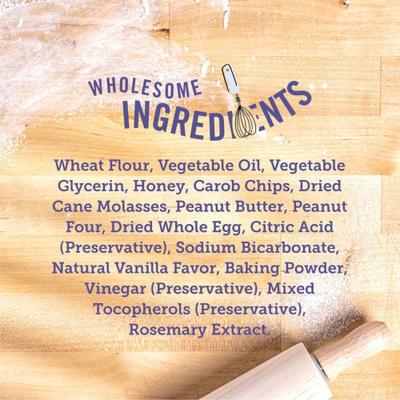 Wheat Flour, Canola Oil, Glycerin, Honey, Peanut Butter, Peanut Flour, Dried Cane Molasses, Dried Whole Egg, Carob Powder, Palm Kernel Oil, Natural Vanilla Flavor, Citric Acid (Preservative), Sodium Bicarbonate, Sunflower Lecithin, Baking Powder, Mixed Tocopherols (Preservative), Vinegar (Preservative).