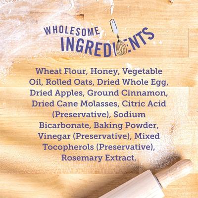 Wheat Flour, Honey, Canola Oil, Rolled Oats, Dried Whole Eggs, Dried Apples, Dried Cane Molasses, Ground Cinnamon, Natural Vanilla Flavor, Citric Acid (Preservative), Sodium Bicarbonate, Baking Powder, Vinegar (Preservative), Mixed Tocopherols (Preservative).