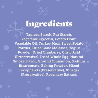 Tapioca Starch, Pea Starch, Vegetable Glycerin, Potato Flour, Vegetable Oil, Turkey Meal, Sweet Potato Powder, Dried Cane Molasses, Yogurt Powder, Dried Cranberry, Citric Acid (Preservative), Dried Whole Egg, Natural Smoke Flavor, Ground Cinnamon, Sodium Bicarbonate, Baking Powder, Mixed Tocopherols (Preservative), Vinegar (Preservative), Rosemary Extract.
