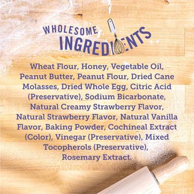 Wheat Flour, Honey, Canola Oil, Peanut Butter, Peanut Flour, Dried Cane Molasses, Dried Whole Egg, Natural Strawberry Cream Flavor, Natural Strawberry Flavor, Sodium Bicarbonate, Natural Vanilla Flavor, Citric Acid (Preservative), Baking Powder, Carmine (Color), Mixed Tocopherols (Preservative), Vinegar (Preservatives).