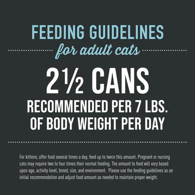 For adult cats, feed approximately 2 1/2 cans per day per 7 lbs. of body weight. For kittens, offer food several times a day, feed up to twice this amount. Pregnant or nursing cats may require two to four times their normal feeding. The amount to feed will vary based upon age, activity level, breed, size, and environment. Please use the feeding guidelines as an initial recommendation and adjust food amount as needed to maintain proper weight.