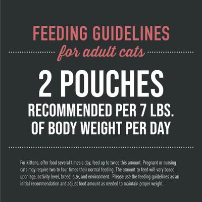 For adult cats, feed approximately 2 pouches per day per 7 lbs. of body weight. For kittens, offer food several times a day, feed up to twice this amount. Pregnant or nursing cats may require two to four times their normal feeding. The amount to feed will vary based upon age, activity level, breed, size, and environment. Please use the feeding guidelines as an initial recommendation and adjust food amount as needed to maintain proper weight.