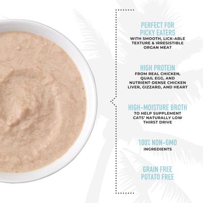 Chicken Broth, Chicken, Quail Egg, Chicken Liver, Chicken Gizzard, Chicken Heart, Dried Egg Product, Sunflower Oil, Tricalcium Phosphate, Xanthan Gum, Potassium Chloride, Choline Chloride, Salt, Magnesium Sulfate, Taurine, Thiamine Mononitrate, Vitamin E Supplement, Ferrous Sulfate, Niacin, Zinc Oxide, Vitamin A Supplement, Biotin, Vitamin B12 Supplement, Manganous Oxide, Copper Amino Acid Chelate, Calcium Pantothenate, Riboflavin, Pyridoxine Hydrochloride, Folic Acid, Potassium Iodide, Vitamin D3 Supplement