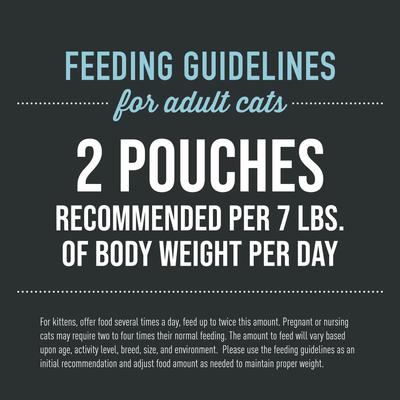 For adult cats, feed approximately 2 pouches per day per 7 lbs. of body weight. For kittens, offer food several times a day, feed up to twice this amount. Pregnant or nursing cats may require two to four times their normal feeding. The amount to feed will vary based upon age, activity level, breed, size, and environment. Please use the feeding guidelines as an initial recommendation and adjust food amount as needed to maintain proper weight.