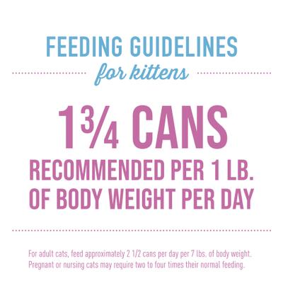 For kittens, feed approximately 1 3/4 cans per day per 1 lb. of body weight. For adult cats, feed approximately 2 1/2 cans per day per 7 lbs. of body weight. Pregnant or nursing cats may require two to four times their normal feeding.