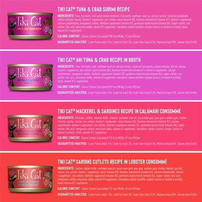 Lanai Luau: Atún ahi en hojuelas, consomé de atún, surimi de cangrejo en hojuelas (besugo, caldo de cangrejo), aceite de semilla de girasol, lactato de calcio. Contiene menos del 1% de lo siguiente: fosfato tricálcico, cloruro de colina, taurina, suplemento de vitamina E, sulfato de zinc, sulfato ferroso, mononitrato de tiamina, niacina, pantotenato de calcio, sulfato de manganeso, acetato de vitamina A, yoduro de potasio, sulfato de cobre, suplemento de riboflavina, clorhidrato de piridoxina, ácido fólico, suplemento de vitamina D3, suplemento de vitamina B12.