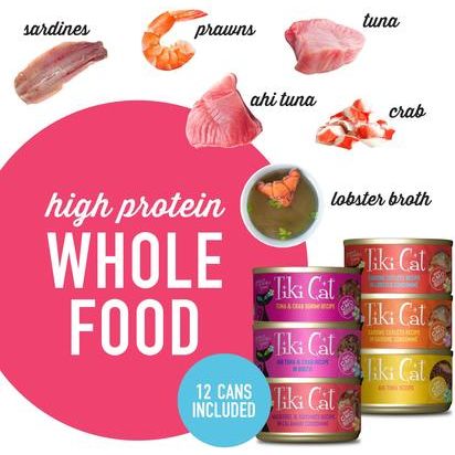 Alimenta a tu gato como un rey con la comida enlatada para gatos Tiki Cat King Kamehameha Luau Variety Pack sin cereales. Inspirada en los sabores de un luau, cada receta gourmet está repleta de proteínas de alta calidad para que tu amigo se vea y se sienta de maravilla. Así que toma la falda de hierba gatera y baila al ritmo de la cena: a tu pequeño carnívoro le encantarán las carnes desmenuzadas en un jugoso consomé en cada lata. Y no solo son deliciosas y están llenas de nutrición completa y equilibrada, sino que las latas fáciles de servir son una excelente manera de proporcionarle a tu gato la hidratación necesaria para que se mantenga saludable. Además, ¡le encantará la variedad de deliciosos ingredientes, como sardina, atún ahi, cangrejo y caballa!