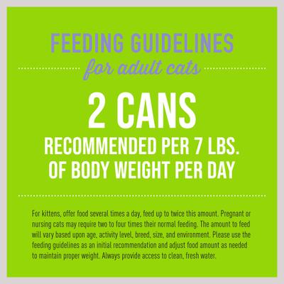 For adult cats, feed approximately 2 cans per day per 7 lbs. of body weight. For kittens, offer food several times a day, feed up to twice this amount. Pregnant or nursing cats may require two to four times their normal feeding. The amount to feed will vary based upon age, activity level, breed, size, and environment. Please use the feeding guidelines as an initial recommendation and adjust food amount as needed to maintain proper weight. Always provide access to clean, fresh water.