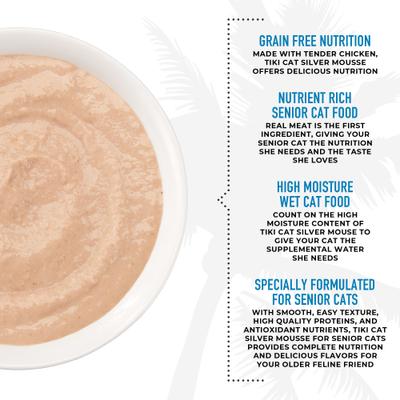 Give your senior feline the ultimate mealtime experience with Tiki Cat Silver Mousse Chicken & Pumpkin Grain-Free Senior Wet Cat Food. This delectable wet food is specially crafted into a smooth mousse texture that’s packed with flavor for your kitty to enjoy. It’s formulated with high-quality protein from real chicken and salmon to help your best friend maintain muscle mass, while nutrient-rich antioxidants support your kitty’s immune system. Made with non-GMO ingredients and low in carbohydrates, this tasty recipe is designed specifically for senior adult cats. The addition of pumpkin as a gentle source of fiber promotes healthy digestion, while the absence of animal by-products, artificial colors, and flavors ensures a wholesome meal for your furry friend.