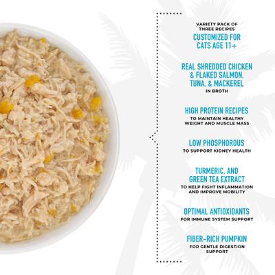- This variety pack features 3 recipes customized for cats ages 11 and older.