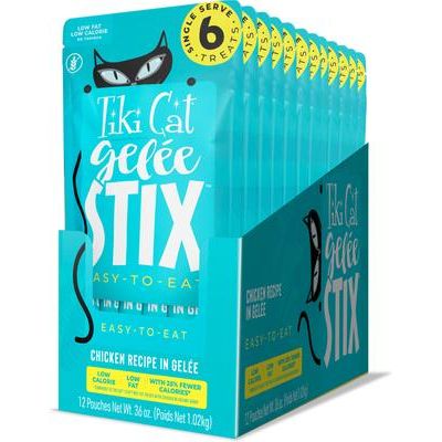 Consiente a tu peludo con las deliciosas golosinas para gatitos Tiki Cat Stix Gelee de pollo. Estas golosinas están hechas con pollo real en una tentadora textura de gelee que mantendrá a tu gatito satisfecho. Con una fórmula baja en grasas y calorías, estas golosinas tienen un 25 % menos de calorías que las golosinas húmedas Tiki Cat Stix con pollo en salsa cremosa (se venden por separado). Su alto contenido proteico y su delicioso caldo mantendrán a tu gatito saciado, con energía e hidratado. Cada paquete individual es súper fácil de alimentar.