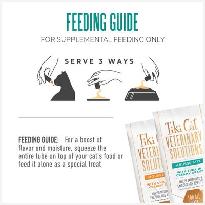 Give your feline friend a stress-free exam experience with Tiki Cat Veterinary Solutions Mousse Stix. These highly palatable and smooth lickable treats are perfectly portioned to help keep your cat occupied and relaxed during exams. They also work to stimulate hunger in cats who may not have much of an appetite. Made with real chicken and tuna, these treats are not only delicious—they offer stress relief without a prescription. Vet visits and grooming appointments are easier than ever with Tiki Cat Veterinary Solutions Mousse Stix.