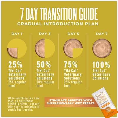 Pets can be sensitive to sudden changes in their diets. For this reason, it is extremely important to follow a gradual transition plan to best support your pet's health and product effectiveness. Ask your Veterinarian about the best way to transition your pet to a new food.