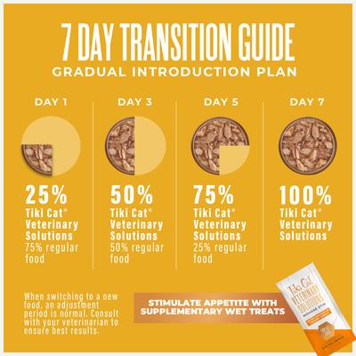 Pets can be sensitive to sudden changes in their diets. For this reason, it is extremely important to follow a gradual transition plan to best support your pet's health and product effectiveness. Ask your Veterinarian about the best way to transition your pet to a new food.