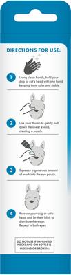 To avoid contamination, do not touch tip of container to any surface. Using clean hand, hold your pet's head with one hand, keeping them calm and stable. Use your thumb to gently pull down the lower eyelid, creating a pouch. Flush the affected eye as needed, controlling the rate of flow of solution by pressure on the bottle.