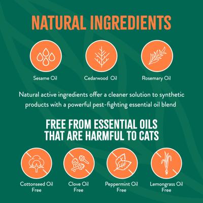 - Formulado con ingredientes naturales y aceites esenciales, lo que lo hace seguro para su uso en gatos.