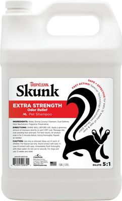AGITAR BIEN ANTES DE USAR. Para eliminar el olor a zorrillo, aplique una cantidad generosa de champú tal cual (sin diluir) directamente sobre el pelaje SECO de su mascota. Masajee el pelaje, evitando la cara y los ojos. Para obtener mejores resultados, deje que el producto actúe durante 5 minutos antes de enjuagar bien. Repita según sea necesario. Si no hay olor a zorrillo, solo suciedad extrema, diluya el champú en una proporción de 5:1 y luego siga las instrucciones anteriores aplicando el champú sobre el pelaje húmedo de la mascota.