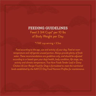 - True Acre Foods chicken and liver recipe tender loaf in gravy is just what your dog needs to keep going strong day in and day out, served in delicious flavors that they’re sure to love.