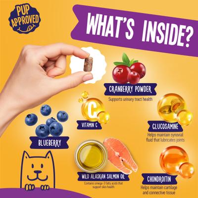 - Formulated with cranberry powder, salmon oil, vitamin C, promoting heart health and dental well-being.