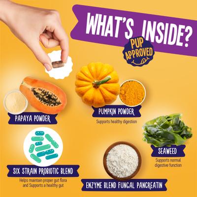 - Formulated with pumpkin and papaya powder, seaweed, fungal pancreatin, and a 6-strain probiotic blend.