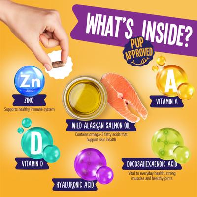 - Contains wild Alaskan salmon oil, zinc, and hyaluronic acid.