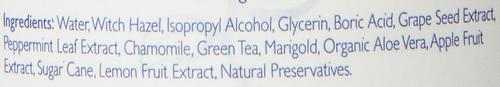 Water, Witch Hazel, Isopropyl Alcohol, Glycerin, Boric Acid, Grape Seed Extract, Peppermint Leaf Extract, Chamomile, Green Tea, Marigold, Organic Aloe Vera, Apple Fruit Extract, Sugar Cane, Lemon Fruit Extract, Natural Preservatives.