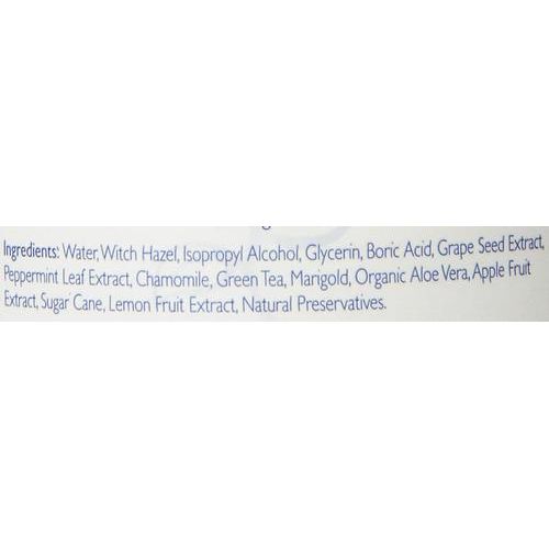 Agua, Bruja Avellana, alcohol isopropílico, glicerina, ácido bórico, extracto de semilla de uva, extracto de hoja de menta, manzanilla, té verde, caléndula, aloe vera orgánico, extracto de manzana, caña de azúcar, extracto de limón, conservantes naturales.