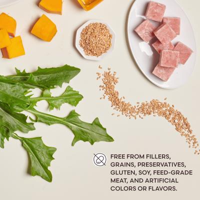 - Feel good knowing this meal is free from fillers, grains, preservatives, gluten, soy, feed-grade meat, and artificial colors or flavors.