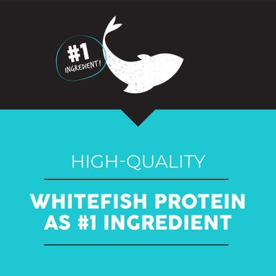 - Real whitefish meal is the #1 ingredient and balanced omega fatty acids support healthy skin, hair coat and immune system. Added L-Carnitine helps your pet burn fat and maintain lean muscle mass.