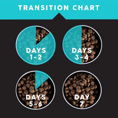Taking care of your dog’s overall health starts by feeding him properly. We suggest using this chart as a guide. Adjust amounts accordingly over time. Please remember these portions are averages and will vary according to age, activity, size and temperament of your Adult dog. Pregnant and lactating female dogs will require 2 - 3 times as much food as Adult feeding guidelines shown. Puppies start to eat solid foods at 3 - 4 weeks of age and should have free access to solid food from this time until weaning. You may keep Ultimates™ Bayside Select™ before your puppy at all times; most puppies will satisfy their nutritional needs as their appetite dictates. When switching to a new food, gradually increase the new food and decrease the old food over a 7 - 10 day period of time until your pet is completely eating Ultimates™ Bayside Select™. Transition Instructions: On days 1 & 2 of the change, you should have plenty of your pet's old food left. Fill the bowl with 3 quarters of the old food, and one quarter of Ultimates. On days 3 & 4, add in another quarter, so you have half old food, half Ultimates. On days 5 & 6, mix one quarter old food and 3 quarters Ultimates. In only 7 days, your pet will be on an all-new diet.