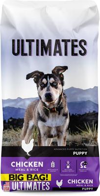 Good health begins with proper feeding. Ultimates can help maintain your dog’s health when combined with exercise, veterinary care, and controlling intake of other food and treats. Use this chart as a guide, adjusting as necessary to maintain optimal weight. Portions will vary according to age, breed, temperament and environment. When introducing Ultimates, mix increasing amounts of Ultimates with decreasing amounts of the current food over a 7 to 10 day period. During gestation and lactation, feed 2 to 4 times the portions recommended for the weight of your adult dog. Puppies often begin to eat solid foods at 3 to 4 weeks of age. Food can be served dry or with warm water (3 parts food to 1 part water). Offer clean, fresh water at all times. See your veterinarian regularly. Feeding amounts are based on a standard 8 oz dry measuring cup. On days 1 & 2 of the change, you should have plenty of your pet's old food left. Fill the bowl with 3 quarters of the old food, and one quarter of Ultimates. On days 3 & 4, add in another quarter, so you have half old food, half Ultimates. On days 5 & 6, mix one quarter old food and 3 quarters Ultimates . On only 7 days, your pet will be on an all-new diet of Ultimates.