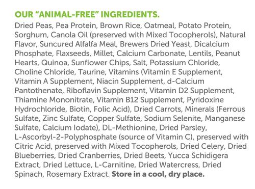 Dried Peas, Pea Protein, Brown Rice, Oatmeal, Potato Protein, Sorghum, Canola Oil (preserved with Mixed Tocopherols), Natural Flavor, Suncured Alfalfa Meal, Brewers Dried Yeast, Dicalcium Phosphate, Flaxseeds, Millet, Calcium Carbonate, Lentils, Peanut Hearts, Quinoa, Sunflower Chips, Salt, Potassium Chloride, Choline Chloride, Taurine, Vitamins (Vitamin E Supplement, Vitamin A Supplement, Niacin Supplement, d-Calcium Pantothenate, Riboflavin Supplement, Vitamin D2 Supplement, Thiamine Mononitrate, Vitamin B12 Supplement, Pyridoxine Hydrochloride, Biotin, Folic Acid), Dried Carrots, Minerals (Ferrous Sulfate, Zinc Sulfate, Copper Sulfate, Sodium Selenite, Manganese Sulfate, Calcium Iodate), DL-Methionine, Dried Parsley, L-Ascorbyl-2-Polyphosphate (source of Vitamin C), preserved with Citric Acid, preserved with Mixed Tocopherols, Dried Celery, Dried Blueberries, Dried Cranberries, Dried Beets, Yucca Schidigera Extract, Dried Lettuce, L-Carnitine, Dried Watercress, Dried Spinach, Rosemary Extract. Store in a cool, dry place.
