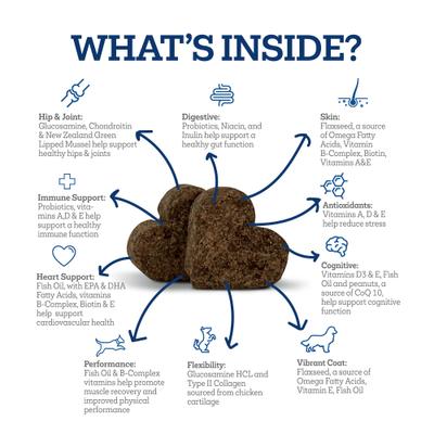 Supercharge your sidekick’s health and wellness with the Vetality 10 in1 Multi Well Bites Dog Supplement! This multi-function supplement for dogs boasts a soft, chewy texture and a tasty chicken flavoring. Featuring omega fatty acids, DHA, probiotics, biotin and much, much more—this daily addition to your pup’s routine can help support mobility, vitality and both digestive and immune health. It even helps your pup look healthier, as its formula includes a vitamin mix that supports healthy skin and a skinny coat.