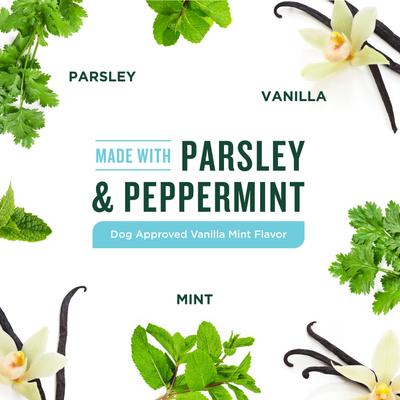 - Real peppermint and parsley help keep your paw-tner’s breath smelling fresh.