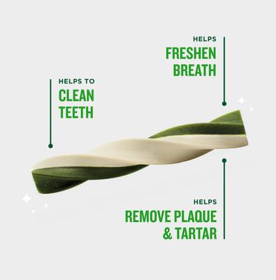 - The twisted texture helps scrape away plaque and tarter with every bite.
